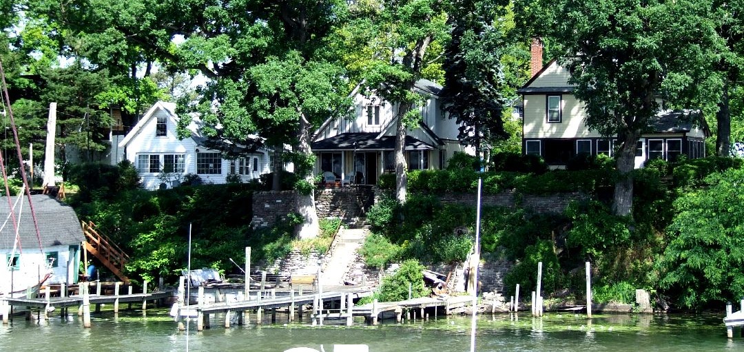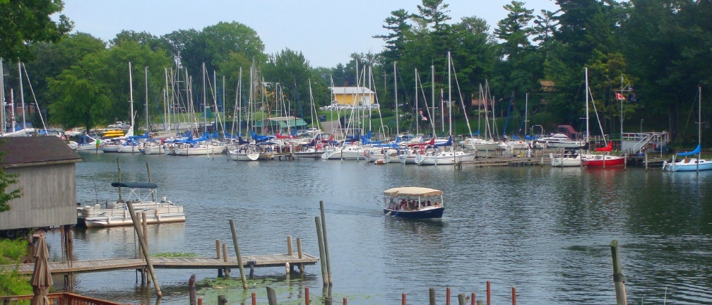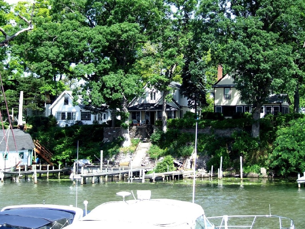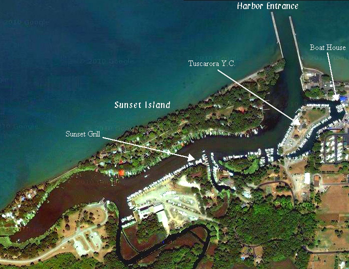 Technically, Sunset Island is not an island but actually two, collectively called one and connected by low-lying narrow spit of land between the smaller western island and its larger sister to the east. This spit has on occasion been washed away by lake storms isolating East Sunset Island. The western smaller island is connected to the mainland and assessable through Tuscarora state park only by path, hence boat access is the primary means of transport. (Aerial view)